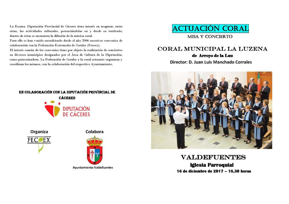 El sábado 16 de diciembre a partir de las 18:30h en el Convento de San Agustín actuará una Coral de la Federación Extremeña de Corales (Patrocinado por la Excma. Diputación de Cáceres).