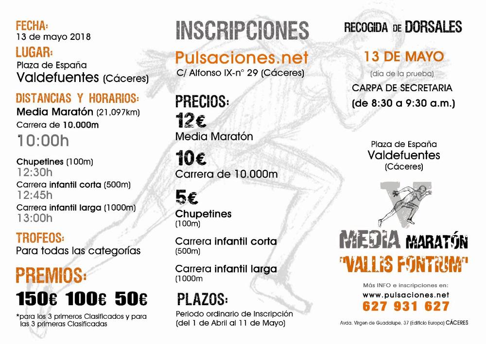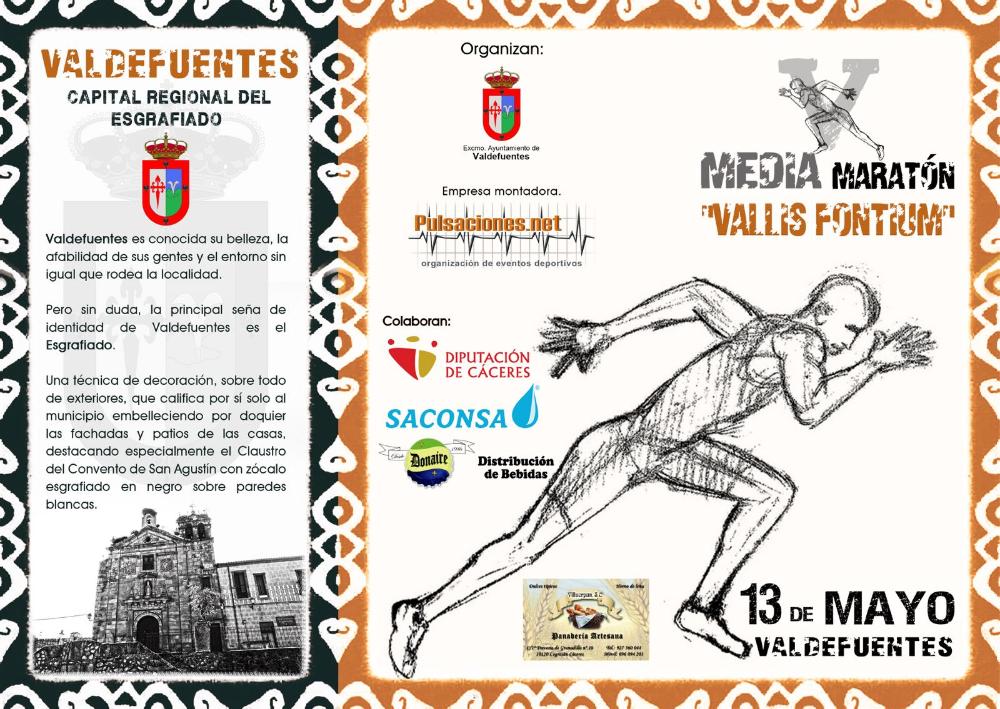 El domingo 13 de mayo se disputará en nuestra localidad la V Media Maratón "Vallis Fontium" con la que pretendemos, entre otros objetivos, dar a conocer a través del deporte nuestros atractivos y recursos paisajísticos y medioambientales, para ello contaremos con la colaboración de varias empresas, y en la que a los tres primeros clasificados/as de la prueba se les obsequiará con sendos trofeos y premios económicos. También se celebrarán diversas pruebas infantiles y trofeos para el/la primer/a clasificado/a local en la media maratón.