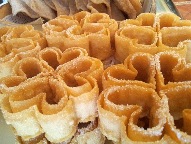 - Las flores. Se hace una masa líquida con harina y huevo. El molde con forma de flor se introduce en la masa, que queda pegada a sus paredes de hierro, y se lleva a la sartén con aceite muy caliente. Se fríen las flores y se dejan enfriar. Finalmente se bañan en miel o en azúcar.