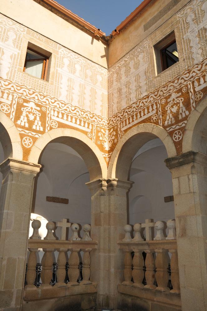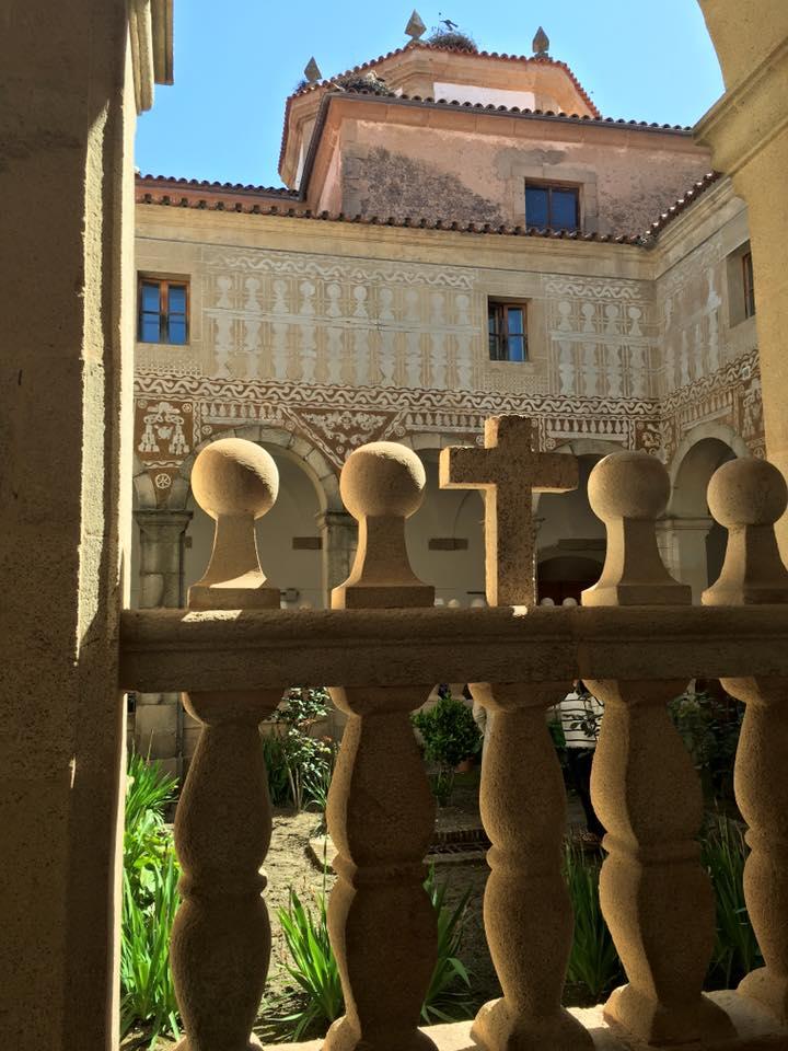 En el recinto del claustro se conjugan los fríos arcos de piedra con el color de las filigranas esgrafiadas en ellos y el frío húmedo de sus paredes y sus bóvedas, la oscuridad de los corredores, con la claridad que desborda la zona central. Un espectáculo de contrastes dignos de admirarse.